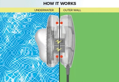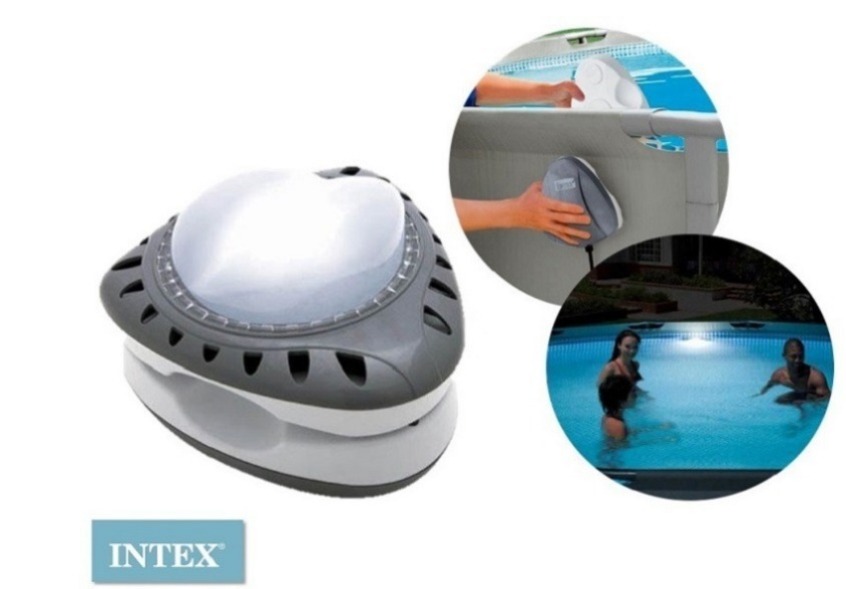 Magnetne LED svjetiljke Intex s 2 načina – statična bijela svjetlost i glatka promjena 4 boje. LED svjetlo koristi magnet za stvaranje sustava koji generira el. tok niskog napona kroz zid bazena. Pogodno za samo bazene s PVC zidom.
