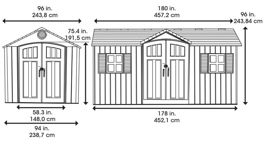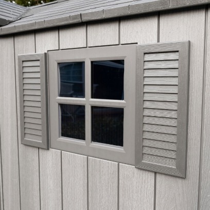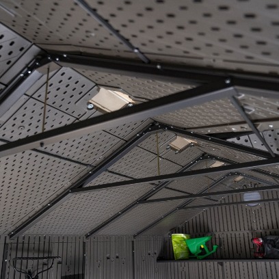 Kućica od polietilena visoke gustoće (HDPE) s dvostrukim stijenkama. Siva boja s venama s efektom drveta, grubo četkana završna obrada. Krov napravljen od čeličnih rešetki i opremljen krovnim prozorom pune dužine. Vrata ojačana čeličnim komponentama; zatvaranje sa zasunom. U kompletu s policom 230x30 cm, 12 zidnih kuka i 2 polukružne kutne police, radijus 24cm. Polica se može postaviti prema vašim potrebama. Brojne zidne kuke idealno su rješenje za vješanje i raspoređivanje predmeta.