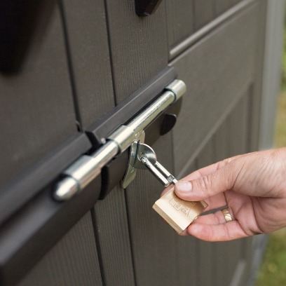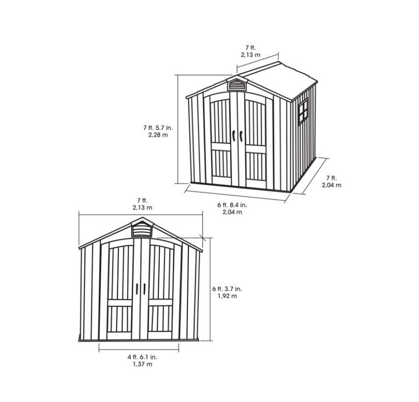 Kućica od polietilena visoke gustoće (HDPE) s dvostrukim stijenkama. Siva boja s venama s efektom drveta, grubo četkana završna obrada. Krov napravljen od čeličnih rešetki i opremljen krovnim prozorom pune dužine. Vrata ojačana čeličnim komponentama; zatvaranje zasunom.