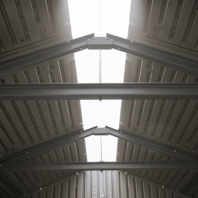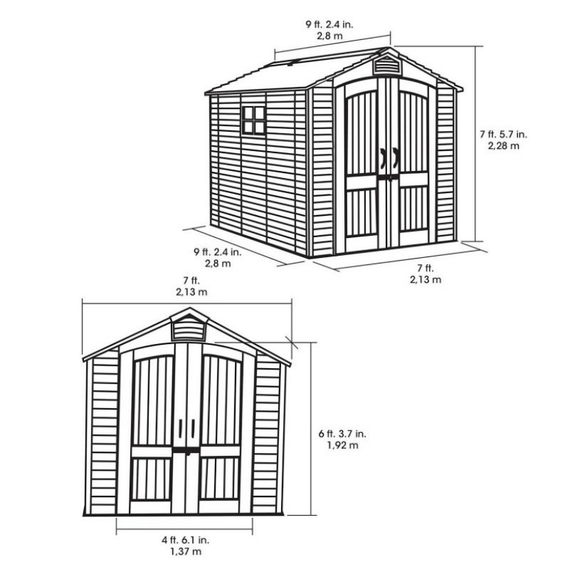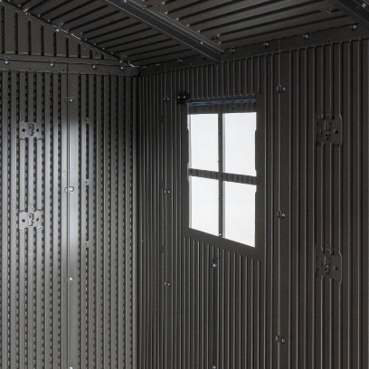 Kućica od polietilena visoke gustoće (HDPE) s dvostrukim stijenkama. Siva boja s venama s efektom drveta, grubo četkana završna obrada. Krov napravljen od čeličnih rešetki i opremljen krovnim prozorom pune dužine. Vrata ojačana čeličnim komponentama; zatvaranje zasunom.