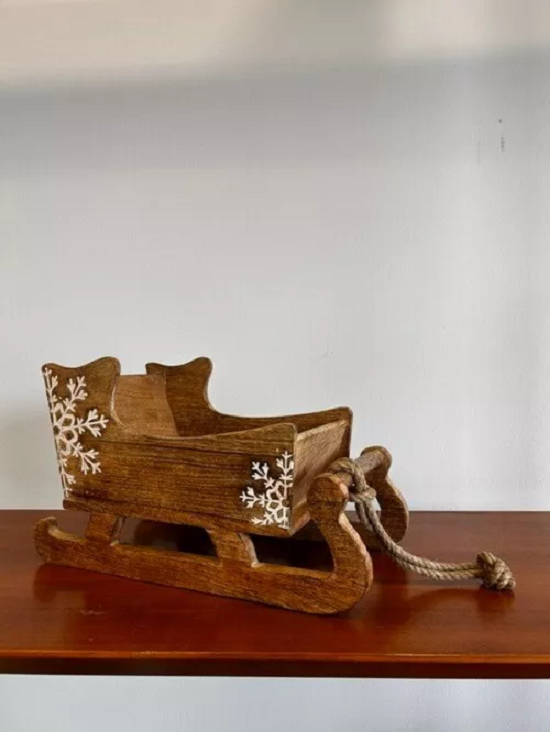 DIMENZIJE: Dekorativne božićne saonice dimenzija 40 cm x 23 cm x 20 cm, izrađene od masivnog drva manga.